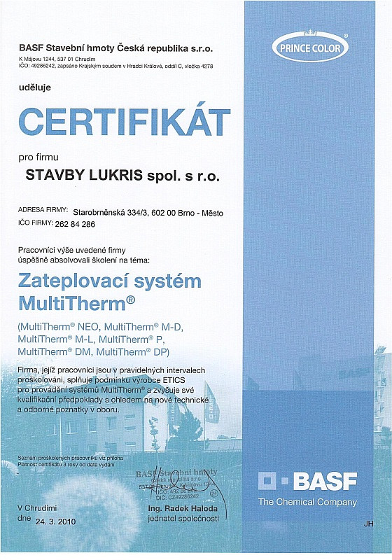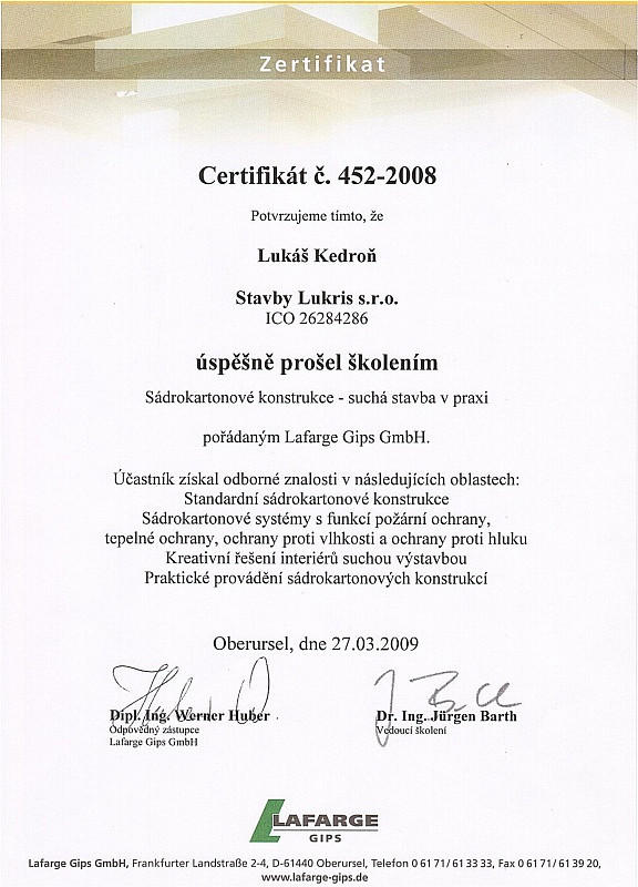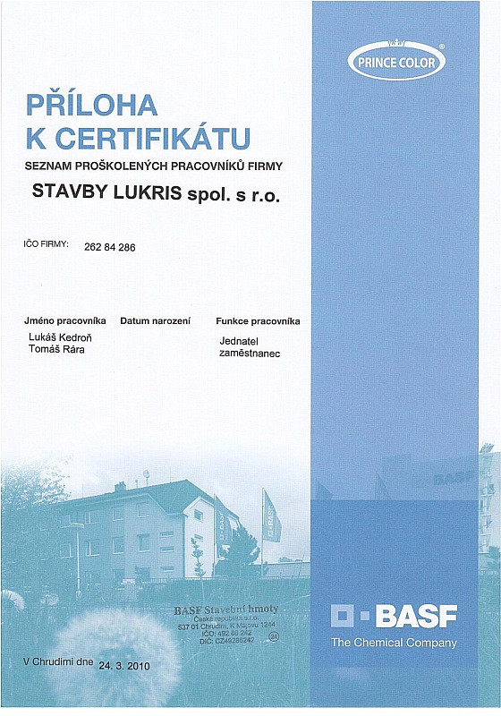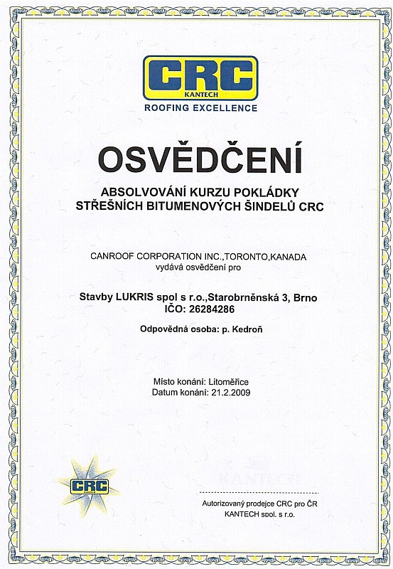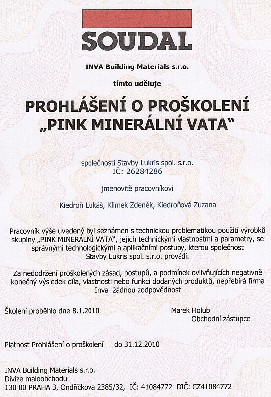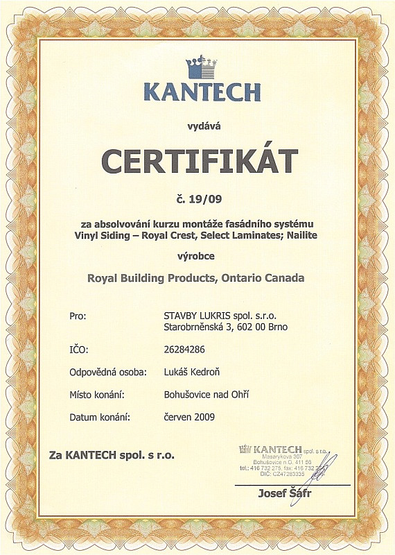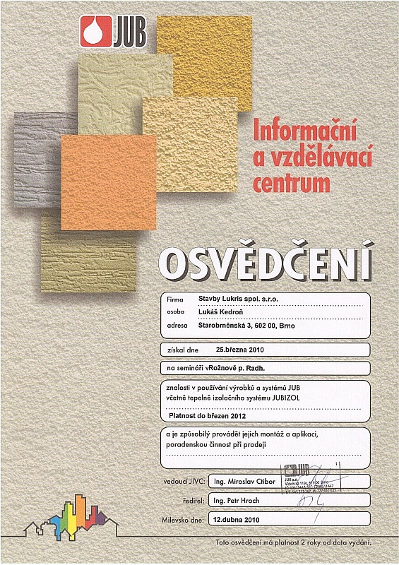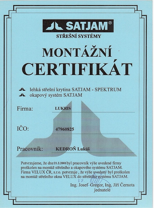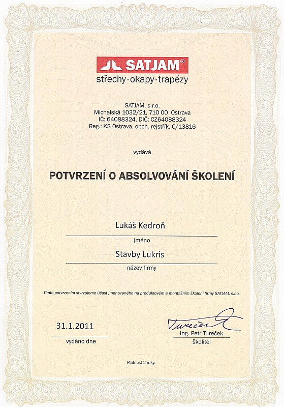 Naše firma dbá na odbornost zaměstnanců, proto se pravidělně účastníme certifikačních školení pro jednotlivé materiály. Díky tomu máme přehled o novinkách v technologických postupech a novinkách na trhu. Všechny nabyté zkušenosti nám pomáhají zkvalitňovat a zdokonalovat služby, které Vám nabízíme.